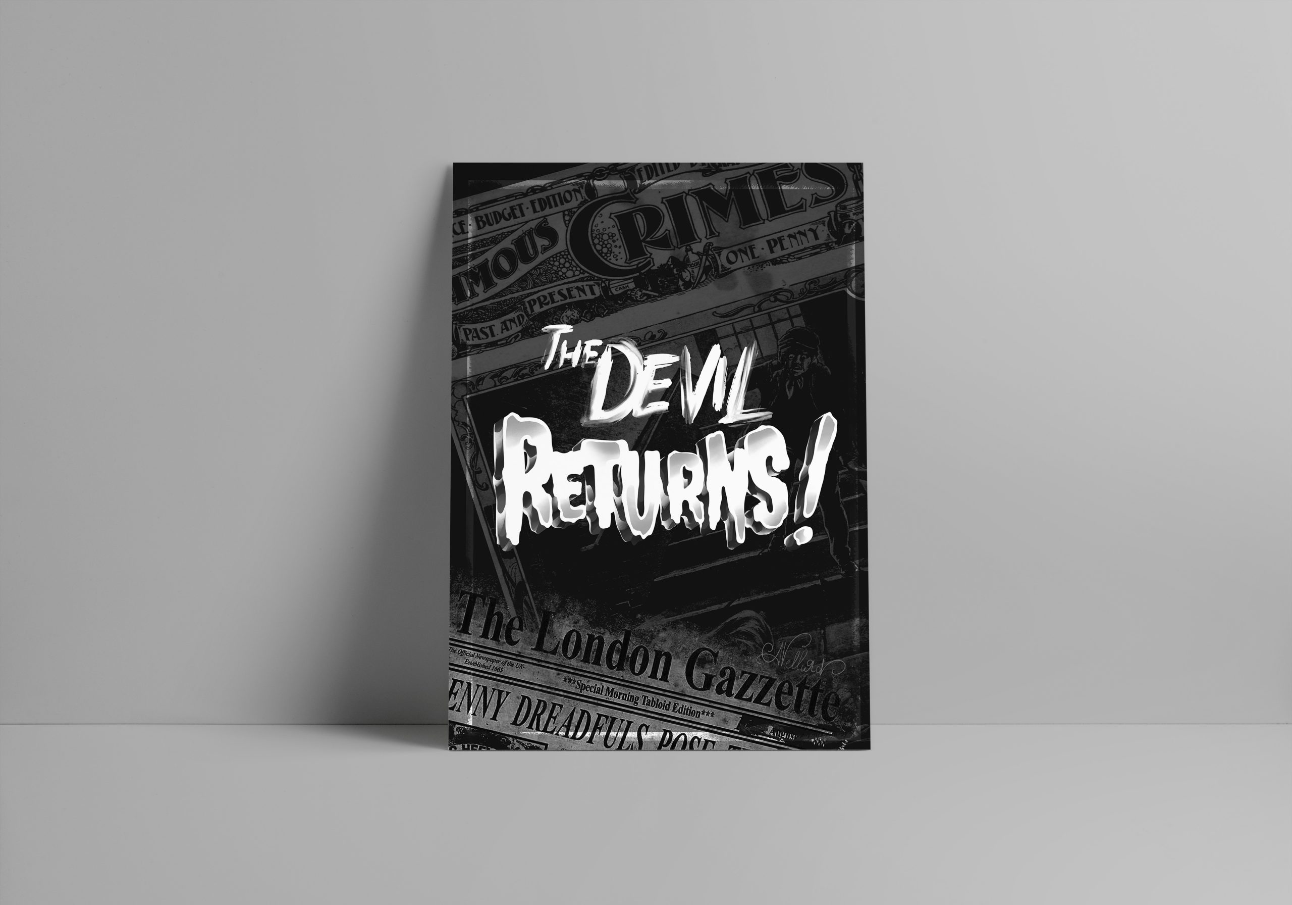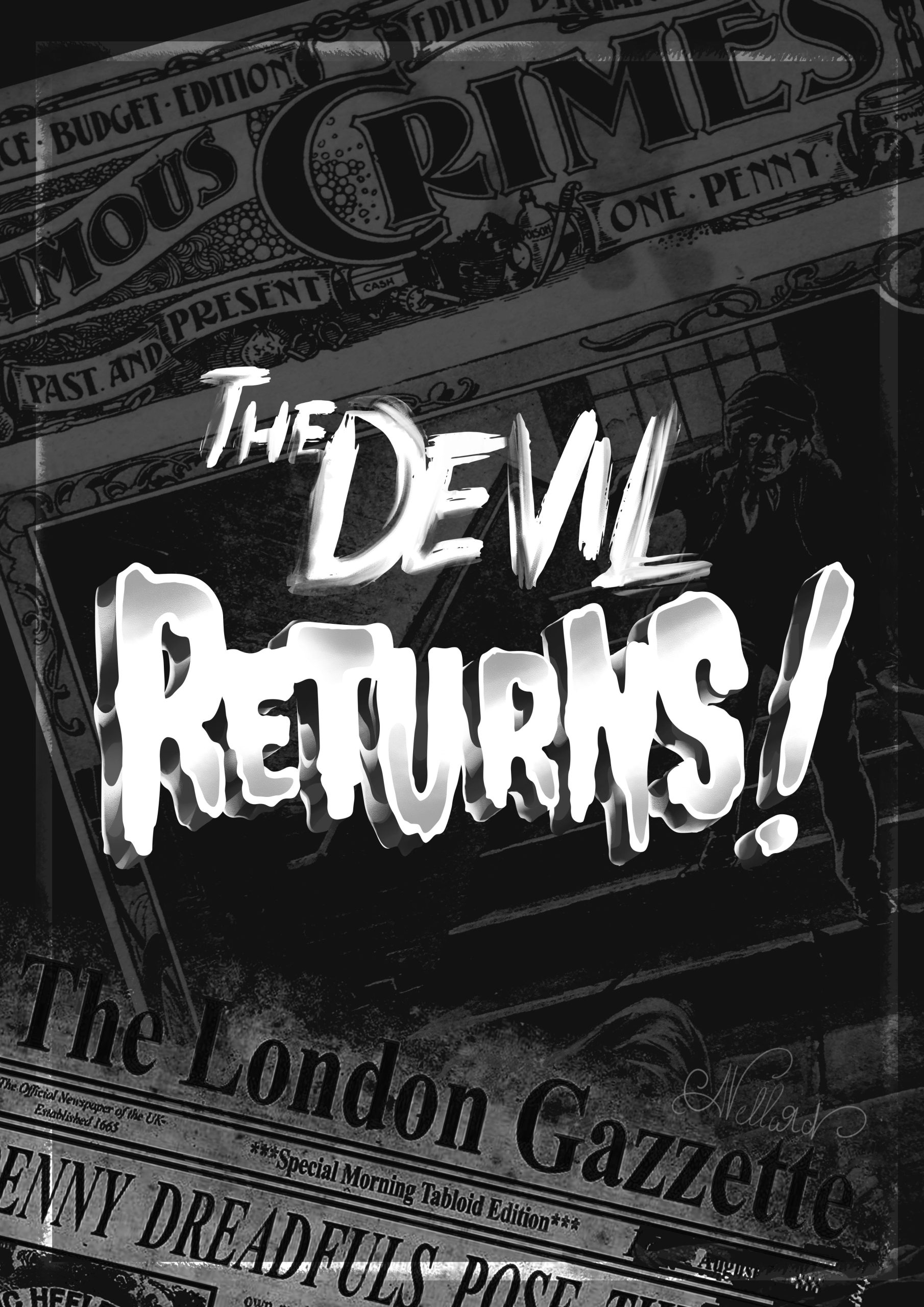 Pour le fond, j’ai travaillé un montage de vieux journaux londoniens exploitant les faits divers de l’époque. J’ai aussi cherché à mettre en avant les « Penny Dreadful » typiques de l’époque, ces petits feuillets à bas prix qui mettaient en scène des histoires horrifiques inspirés des multiples crimes de l’actualité.