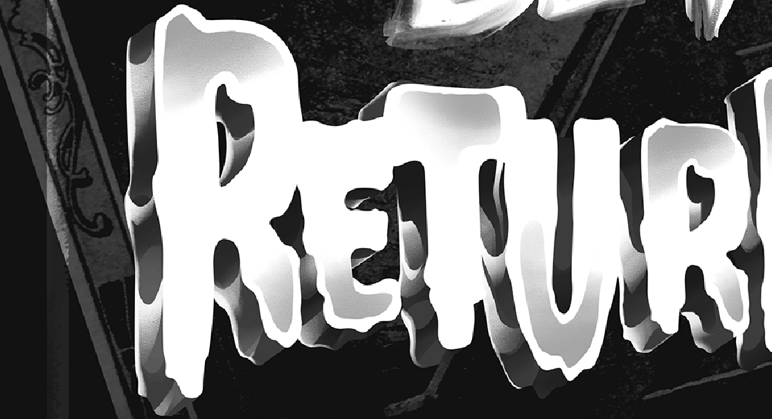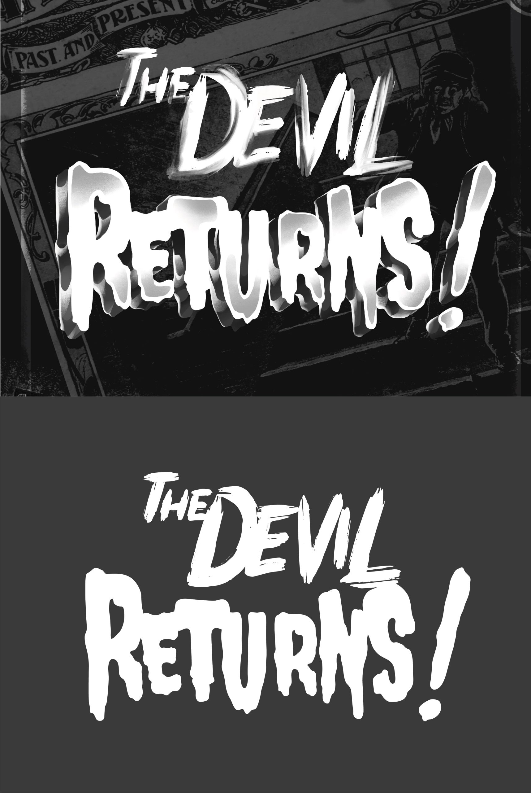 J’ai choisi une typographie (déjà existante) plutôt classique et lisible pour « the Devil », que j’ai associé à une typographie(déjà existante) beaucoup plus affirmée et expressive pour le « Returns ! ». J’ai travaillé le « Devil » dans un léger aspect vaporeux pour un effet dilué, puis j’ai travaillé « Returns » dans un traité très retro, dans le style des affiches vintage aux typographies très fortes et affirmées de ces vieux films d’horreur. Ces titres à l’ancienne se distinguent par des lettres très définies et habitées par ce coté effrayant flirtant avec le kitsh. J’ai cherché à conserver cette veine graphique tout en restant sur une palette exclusivement en nuances de gris.